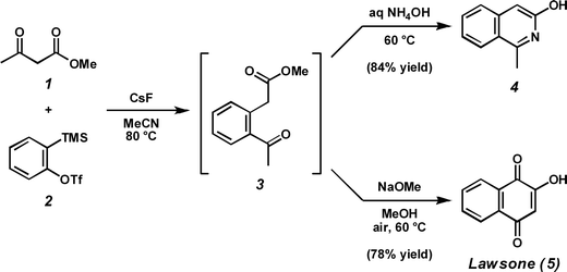 -ketoesters (1) and arynes derived from silyl aryl triflates (2),5 we began to investigate avenues by which the acyl-alkylated arene products (3) could be advanced toward larger ring systems (Scheme 1).6 Our interest in nitrogen-containing heterocycles7 led us to a report by Bentley et al., in which the synthesis of both 3-hydroxyisoquinolines (4) and 2-hydroxy-1,4-naphthoquinones (5) is accomplished by exposure of 1,5-ketoesters similar to 3 to either aqueous ammonia or alkaline base under an ambient atmosphere, respectively.8 Indeed, we found that treatment of a crude acyl-alkylation reaction mixture containing methyl (2-acetylphenyl)acetate (3) with aqueous ammonium hydroxide furnished 1-methyl-3-hydroxyisoquinoline (4),9 while addition of sodium methoxide generated lawsone (5), an isolate from the henna plant Lawsonia inermis.10