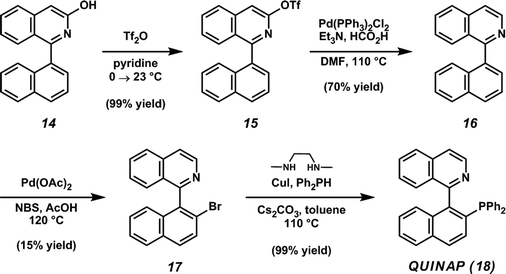 hydroxyisoquinoline (14) is subjected to triflation. Next, reduction of triflate 15 yields naphthyl isoquinoline 16, which is subsequently brominated via a nitrogen-directed palladium-catalyzed C–H activation.23 Finally, a modified version of Buchwald