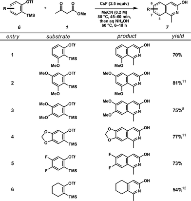 Focusing on the first of these two transformations, we investigated the reaction between methyl acetoacetate (1) and a number of functionalized aryne precursors (6) (Table 1). The sequence proved quite general, providing rapid access to a number of 3-hydroxyisoquinoline products (7)