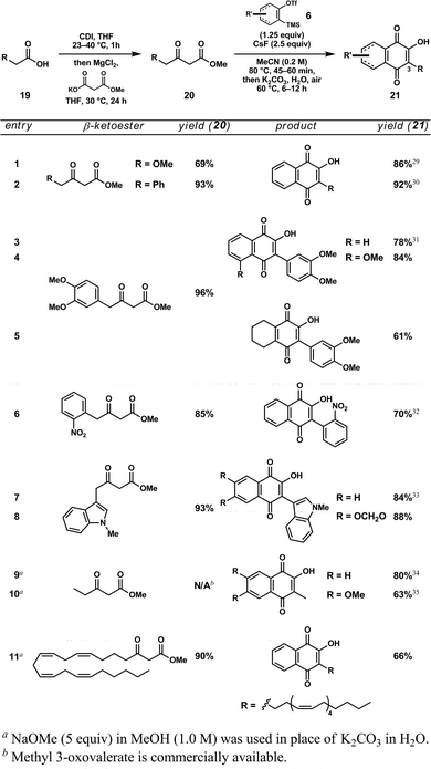 | 26 | Bentley et al. made a similar observation using methyl 2-(4,5-dimethoxy-2-acetylphenyl)acetate and later optimized the reaction for the formation of the hydroxynaphthoquinone in 53% yield using aqueous sodium hydroxide. See ref. 8. | |
